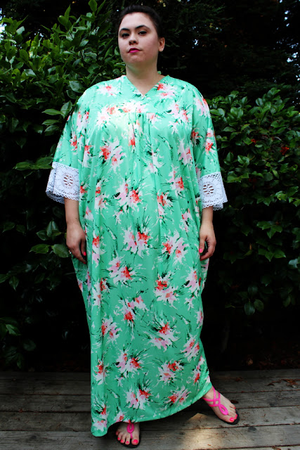 | Plus Size Vintage 1970’s Green Abstract Print Knit Lace Detail Kaftan Dress (Size 24/26) |